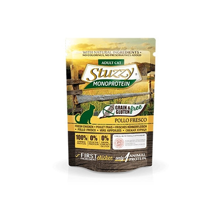 Die neuen Stuzzy Monoprotein wet Grain Free Beutel für Katzen: Ohne Getreide oder Gluten macht der Anteil an tierischem Protein 100 % des Proteinanteils aus.