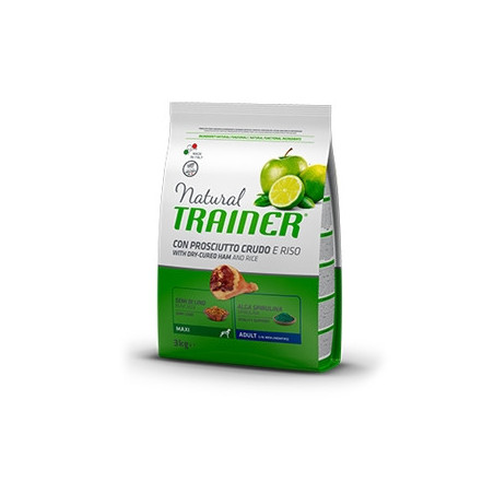 Natural Trainer Adult Maxi wird aus einer Kombination aus Schinken und Reis hergestellt, mit den Vorteilen von Leinsamen und Spirulina-Algen als funktionelle Zutaten.
