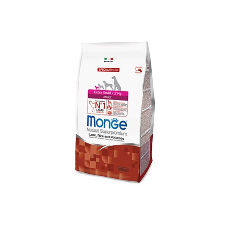 Monge Natural Superpremium Specialty Line Extra Small Adult Kroketten mit Lamm, Reis und Kartoffeln sind ein Alleinfutter für sehr kleine ausgewachsene Hunde.