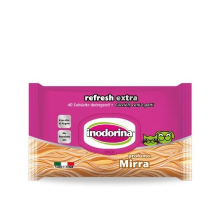 Inodorina refresh extra wipes with myrrh are scented wipes in resistant fabric, moistened with a unique formulation based on argan oil, rich in vitamins (A, E, F) and known for its soothing, nourishing and moisturizing properties. Inodorina Refresh extra, respecting the natural Ph, deodorizes and polishes the coat of cats, dogs and puppies, releasing a pleasant scent.