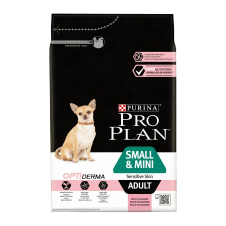 Purina® PRO PLAN® Small & Mini Adult OptiDerma is a complete food for small and mini breed adult dogs with sensitive skin.