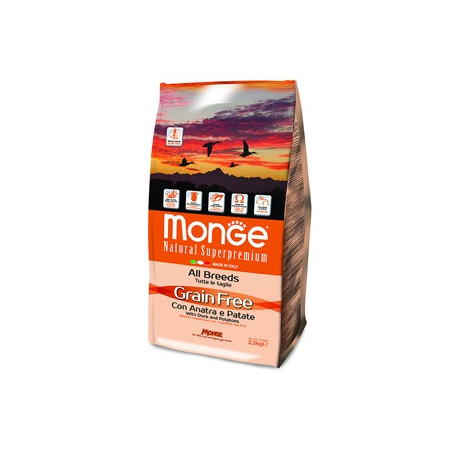 Highly digestible and palatable, Monge Grain Free with Duck and Potatoes has a high protein value.